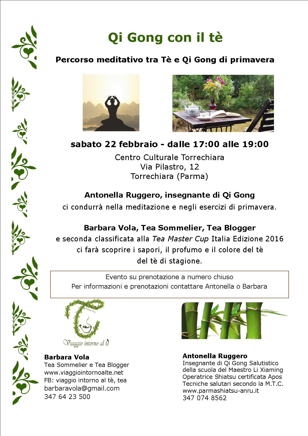 - sabato 22 febbraio dalle 17 alle 19 “Il Qi Gong con il tè” presso Centro Culturale Torrechiara (Parma). Contattare Antonella al 347 0748562 o Barbara al 347 6423500