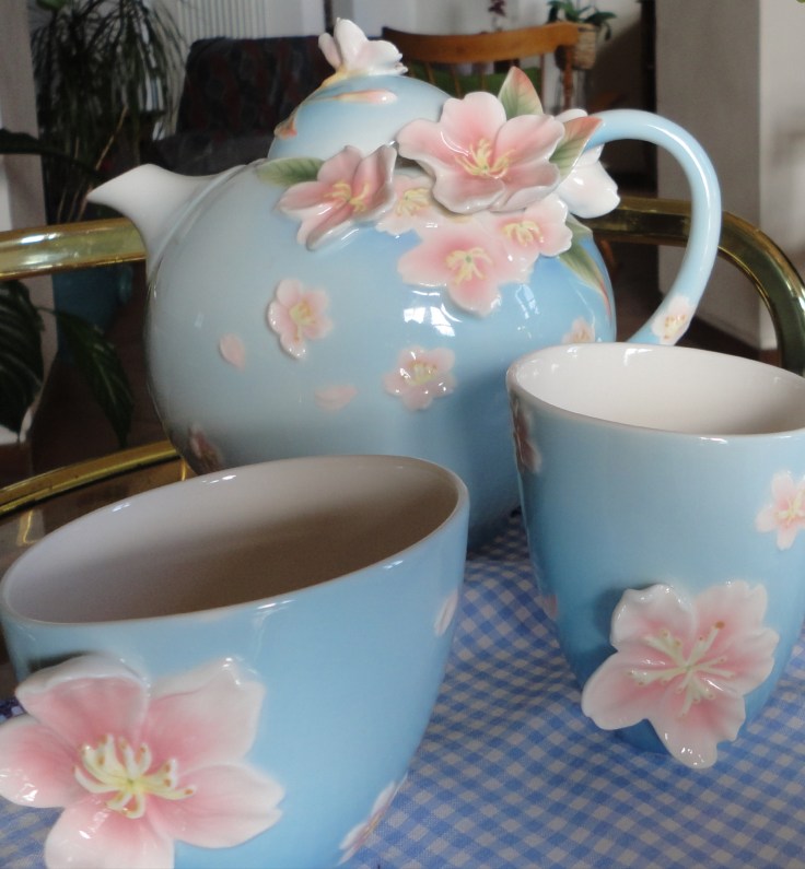 Da dove nasce un tè giapponese? Dalla lettura della Cerimonia del tè? Da un viaggio a Tokyo? Da una cena a un ristorante giapponese? Troppo facile. Un tè giapponese nasce da un fiore di ciliegio. Il mio è sbocciato su una teiera. Si è poi moltiplicato lungo il manico, sui mug dalle forme variabili, si è posato delicatamente sul piattino. Si è trasformato in ikebana. Ha chiesto sostegno alle aghiformi foglie di tè, a improbabili sushi dolci, ai fragili decori di bacchette porcellanate, a tappetini di bambù, a immagini antiche su libri preziosi. Ha risposto al sogno a lungo coltivato di esserci in un giorno di grazia della vita nel mare di rosa dei ciliegi in fiore.