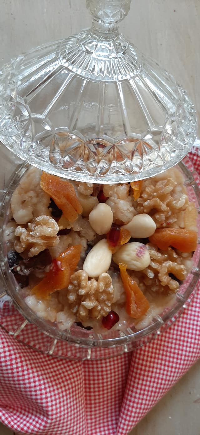 Fare sciogliere lo zucchero in una tazza di acqua calda, aggiungere all’orzo l’uvetta e le albicocche lavate e tagliate in quarti. Fare cuocere ancora per mezz’ora, sempre mescolando, sino ad ottenere la consistenza di un budino. Spegnere e lasciar intiepidire per un’altra mezz’ora. Aggiungere l’acqua di rose, mescolare delicatamente e versare in coppette singole o in una grande coppa. Guarnire con i gherigli di noce, le mandorle e i grani di melograno. Prima di servire spolverizzare con la cannella.