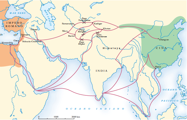 - Dinastia Han (206 a.C. – 220 d.C): il Confucianesimo diventa l’ideologia ufficiale della classe dominante (136 a.C.). Viene inventata la carta e si apre la “Via della seta” (114 a.C.) che collegherà la Cina al vicino Oriente e al Mediterraneo. Era una rete via terra e via mare che permetteva di scambiare le merci e cultura da ambo i sensi. Infatti le filosofie e religioni, come il Buddismo Mayahana (70-50 a.C) arriva in Cina dall’India, utilizzando questa rete interna.