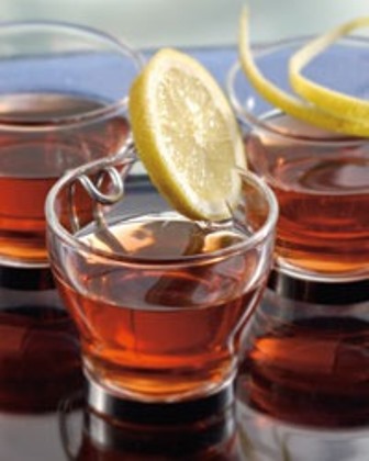 Versare in una coppa riscaldata precedentemente e guarnire con fette di limone e arancio.