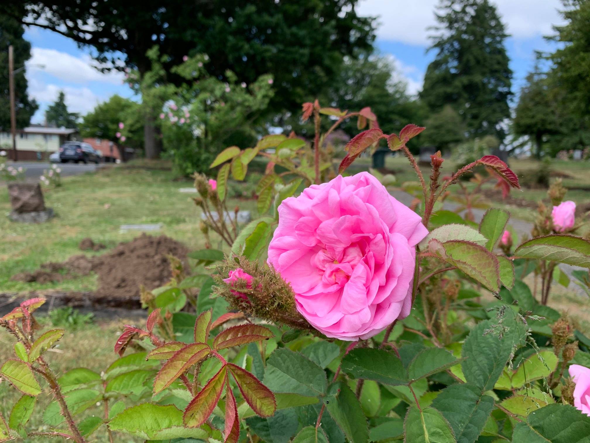 Come già visto nelle tappe precedenti, i cimiteri sono spesso una fonte molto importante per reperire rose antiche. Se non è possibile risalire all’identità della rosa, le si attribuisce il nome della persona che riposa nella sepoltura adiacente, come nel caso di questa bellissima varietà battezzata ‘Charles Burns’ che si trova nel Cimitero dei Pionieri di Eugene, sempre nell’Oregon.