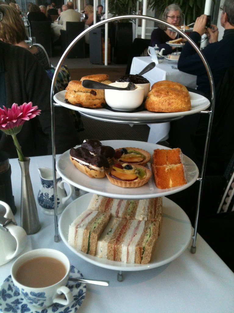 Sostanziosa perché consiste in tre tramezzini diversi farciti con il prosciutto cotto o la fesa di tacchino, uno con i cetrioli freschi su base di formaggio cremoso e l’ultimo con il salmone con il pane spalmato di burro. In seguito si serve della piccola pasticceria, gli scones, piccole focaccine, con il mascarpone, in sostituzione della clotted cream, e la marmellata, infine una buona fetta di torta, magari un buon pandispagna farcito.