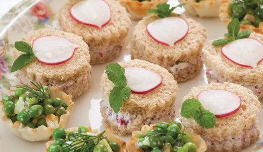 Guarnite ogni tramezzino con una fetta di ravanello e un rametto di menta.