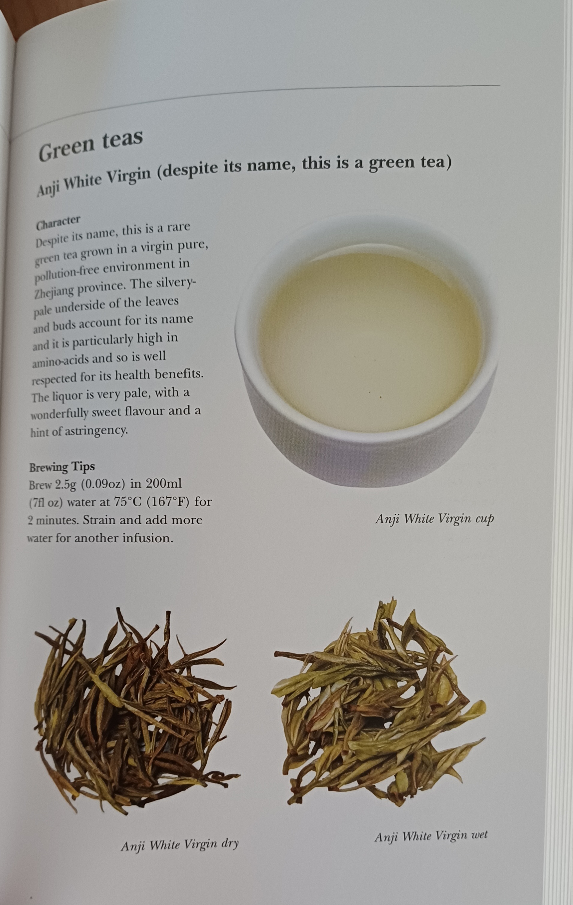 Come puoi vedere è tutt’altra cosa in quanto si vede il colore chiaro di questo tipo di tè, faccio notare che non per forza un tè verde deve essere di un colore verde. Jane Pettigrew fa notare anche la differenza delle foglie secche e poi infuse. Il colore non viene nascosto dalla nuance arancione che prevale nella foto di Letizia.