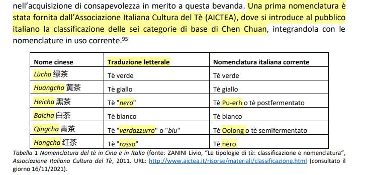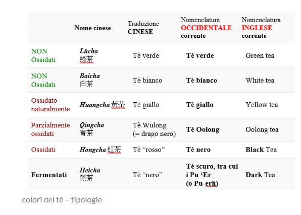 In questo capitolo e in particolar modo nel paragrafo “Tutti gli errori sui nomi del tè“. Sicuramente in Europa i colori del tè fanno venire mal di testa perché, purtroppo, è tutto nato dal passato, ovvero da quando il tè arrivava in Europa. Il sinologo Livio Zanini e Marco Bertona hanno scritto i loro punti di vista a tal proposito. Io stessa pubblicai in un mio articolo lo schema e questo secondo la cultura inglese, paese che ha fatto conoscere il tè in Europa. Leggere il “Nome da me adottato” mi fa strano e mi domando con quale titolo o ruolo. Non era sufficiente scrivere la nomenclatura adottata in Europa e poi fare la specifica sui tè rossi visto che come chiama lei i tè sono le classificazione in uso in Occidente? Lei ha semplicemente unito quello di Zanini e di Bertona.